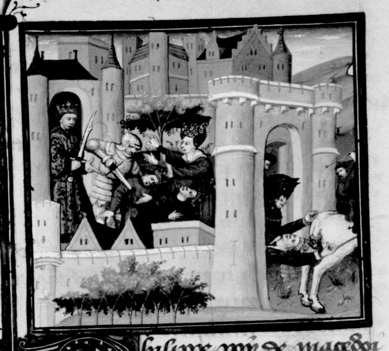 Parigi, Bibliothèque Nationale de France, Fr. 236, f. 53v. Gaio Mario si fa uccidere dal suo schiavo; un esercito è accampato fuori le mura della città.