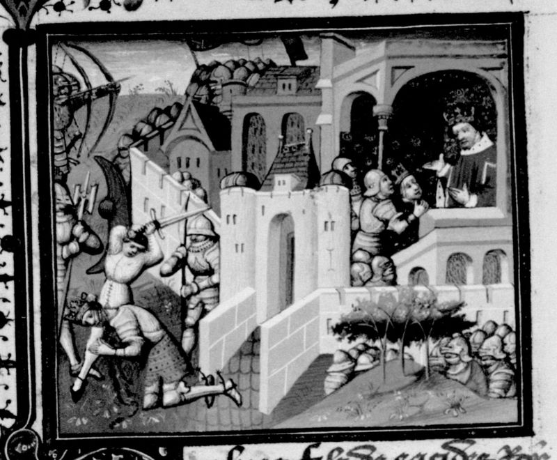 Parigi, Bibliothèque Nationale de France, Fr. 236, f. 20v. Due eserciti si affrontano in battaglia davanti alle mura di Costantinopoli.