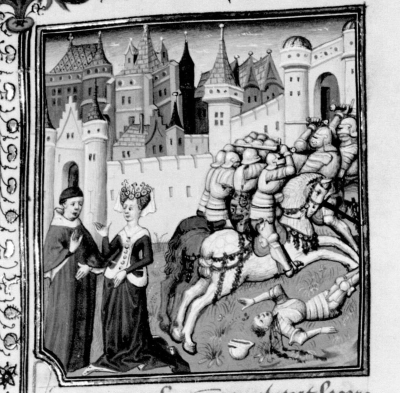 Parigi, Bibliothèque Nationale de France, Fr. 235, f. 172r. Pirro II viene decapitato; Antigono riceve la testa di Pirro.