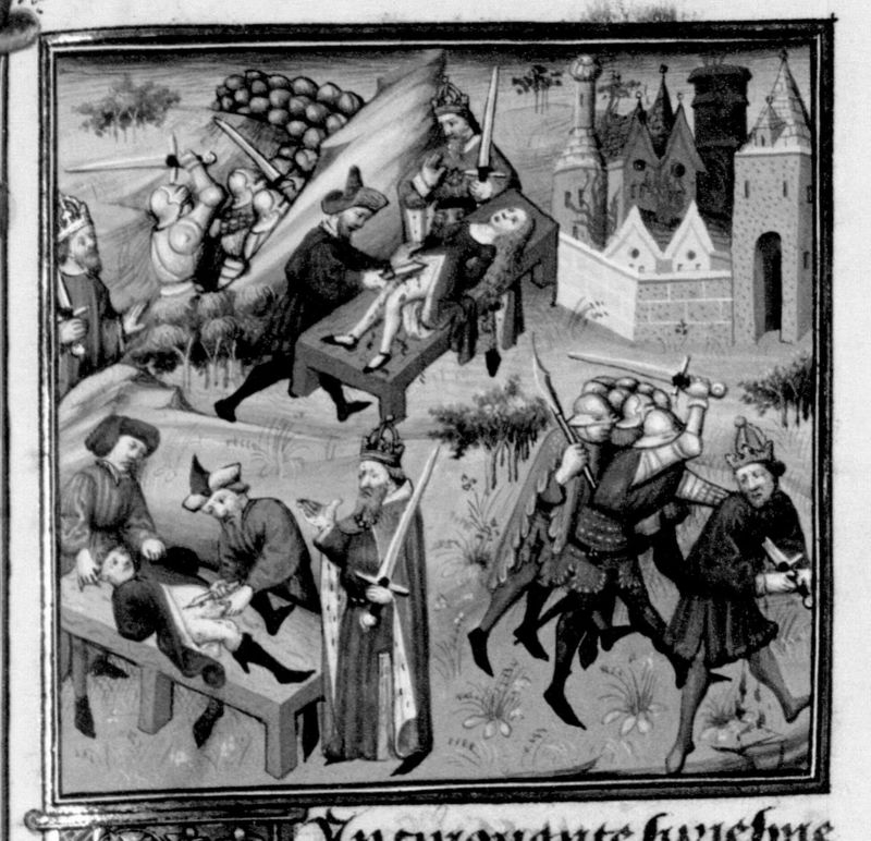 Parigi, Bibliothèque Nationale de France, Fr. 236, f. 66v. Orode, re dei Parti, fa decapitare il figlio di Licinio Crasso, cui sono state amputate le mani; all'interno della città …