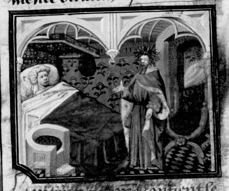 Parigi, Bibliothèque Nationale de France, Fr. 236, f. 134v. Francesco Petrarca appare in sogno a Giovanni Boccaccio.