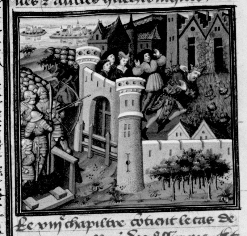 Parigi, Bibliothèque Nationale de France, Fr. 235, f. 60v. Sardanapalo si getta nel rogo del palazzo con i suoi tesori; all'esterno delle mura si trova l'esercito degli assedianti.