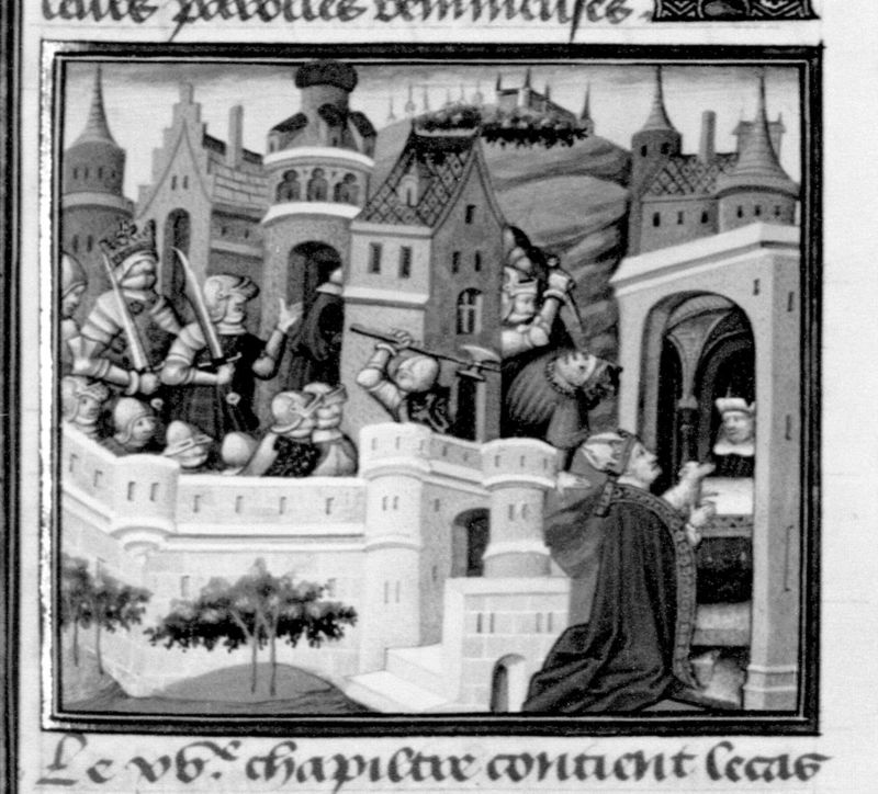 Parigi, Bibliothèque Nationale de France, Fr. 235, f. 65r. L'esercito di Ioas espugna Gerusalemme; Amasia viene ucciso; Ozia brucia dell'incenso presso un altare.