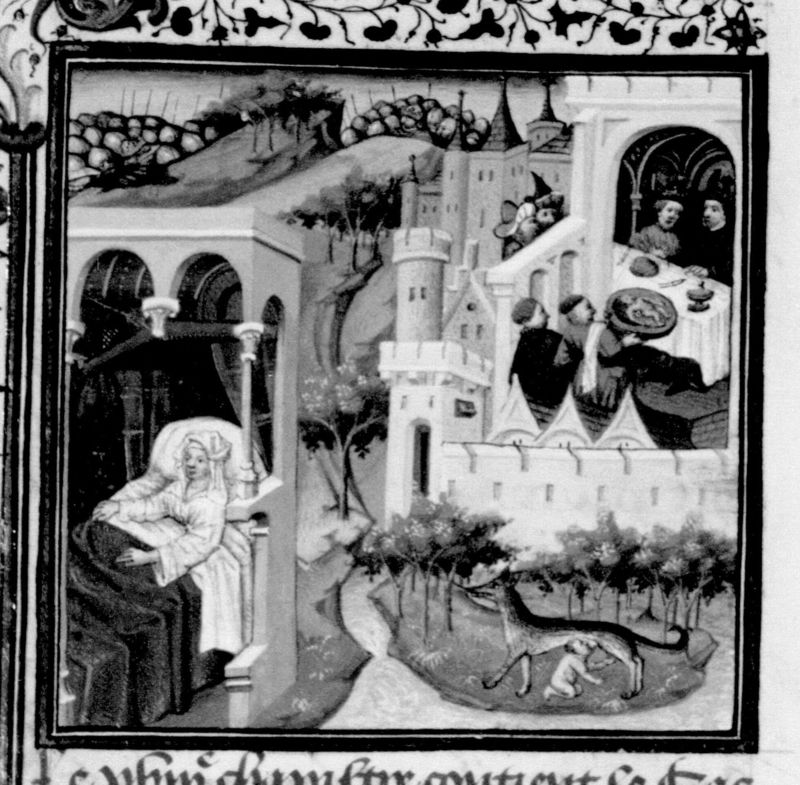 Parigi, Bibliothèque Nationale de France, Fr. 235, f. 70r. Re Astiage ha un sogno premonitore (?); il piccolo Ciro allattato da una cagna; durante un banchetto Astiage fa servire a…