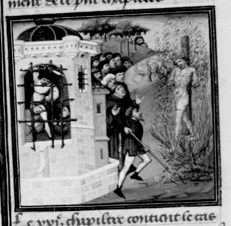 Parigi, Bibliothèque Nationale de France, Fr. 235, f. 124r. Annone, con le mani mozzate, viene giustiziato dinanzi alla folla.