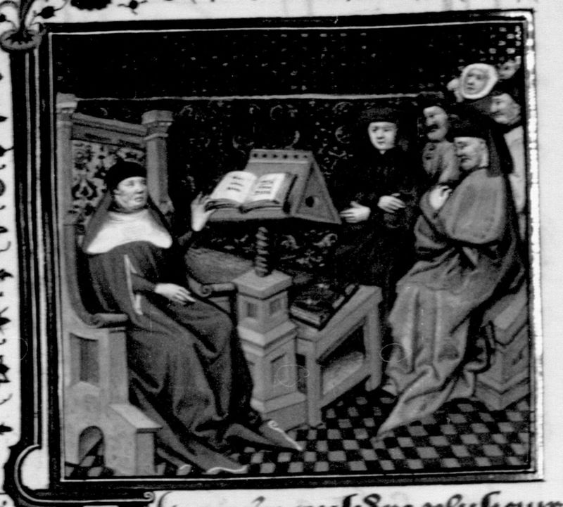 Parigi, Bibliothèque Nationale de France, Fr. 235, f. 113v. L'autore Giovanni Boccaccio siede dinanzi ad un leggio e si rivolge ad un gruppo di legisti.