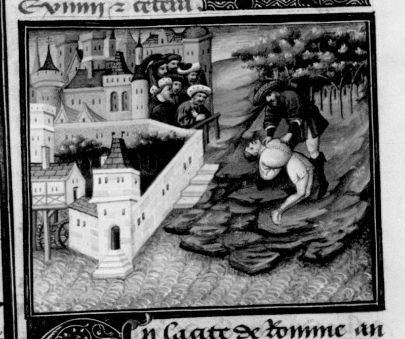 Parigi, Bibliothèque Nationale de France, Fr. 235, f. 133v. Marco Manlio Capitolino viene gettato dalla rupe Tarpea.