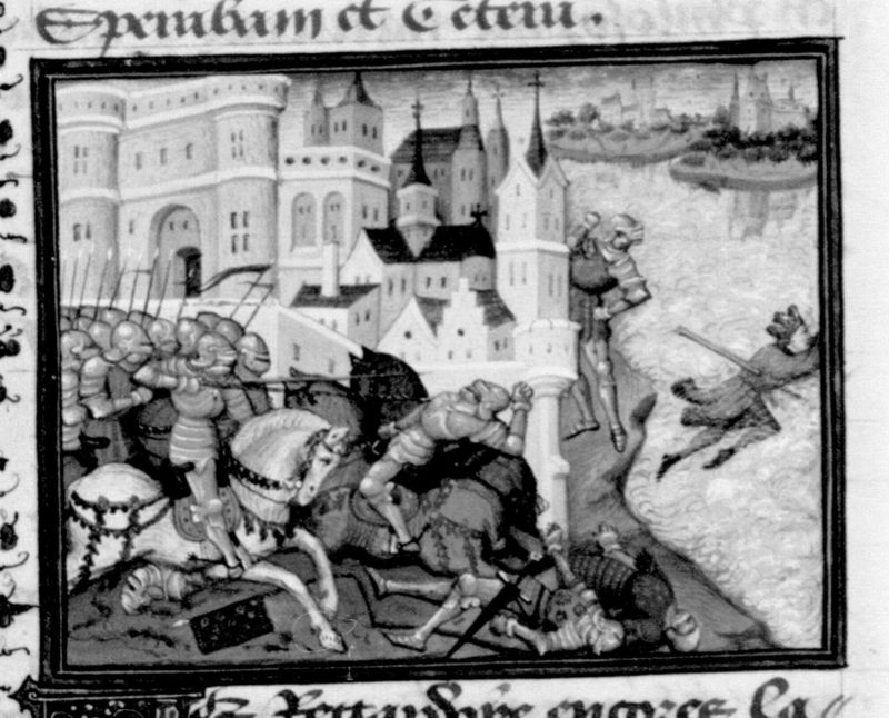 Parigi, Bibliothèque Nationale de France, Fr. 235, f. 144v. Durante lo scontro tra due eserciti a cavallo Alessandro I, re dell'Epiro, viene trafitto da un soldato con una lancia m…