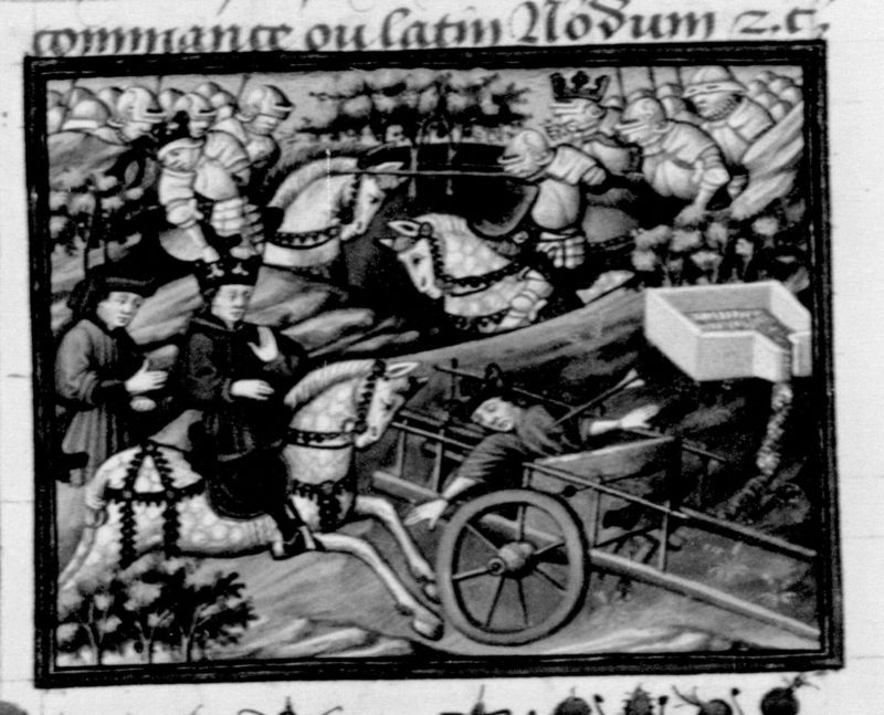 Parigi, Bibliothèque Nationale de France, Fr. 235, f. 146v. Dario, re di Persia, viene colpito a morte da un dardo mentre si trova prigioniero in ceppi su un carro; l'esercito mace…