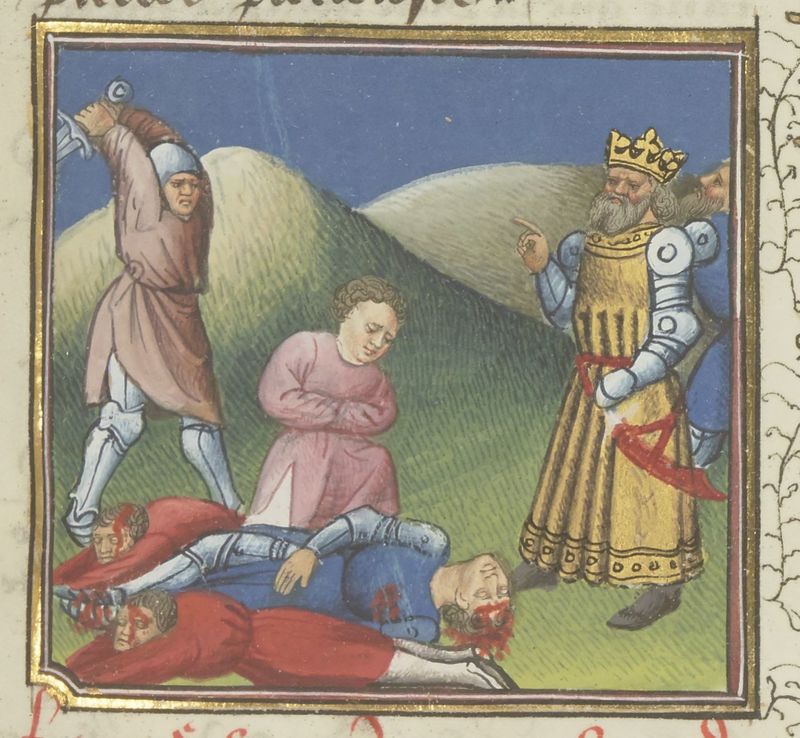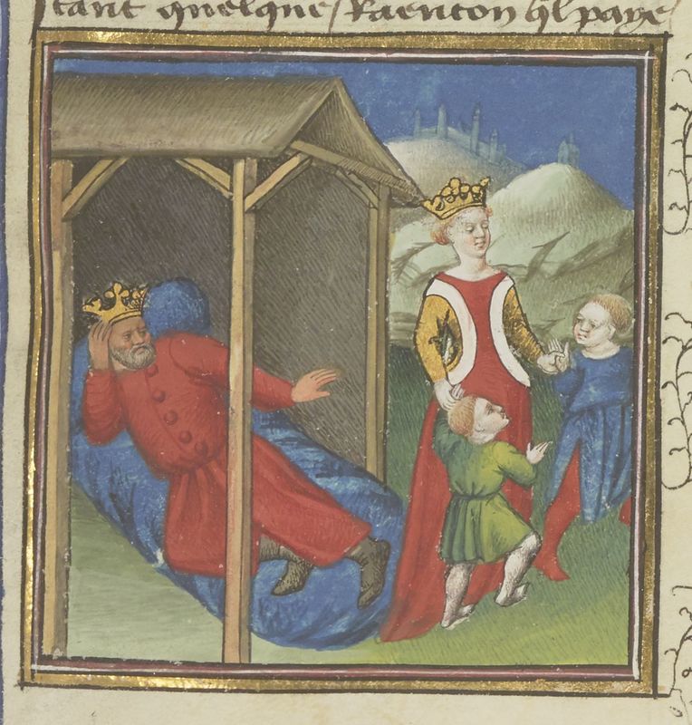 Parigi, Bibliothèque Nationale de France, Fr. 229, f. 130r. Il copista del manoscritto è Boniface de Remenant. Artaserse ordina il massacro dei propri figli.
