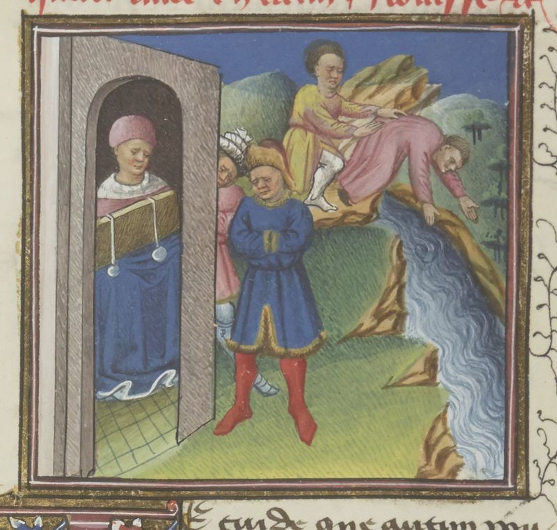 Maestro del Roman de la Rose di Vienna (1435-1440), Boccaccio e due personaggi colpiti dalla sfortuna; Manlio Capitolino gettato dalla rupe Tarpea