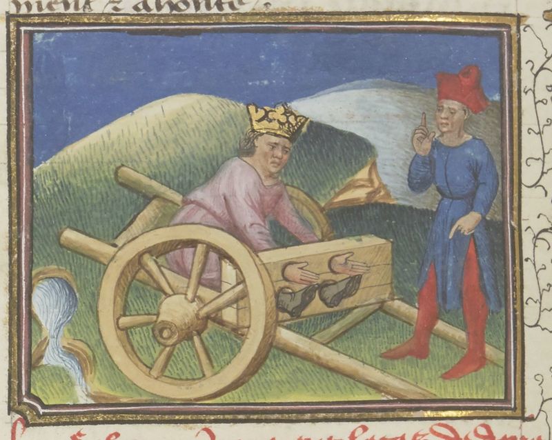 Parigi, Bibliothèque Nationale de France, Fr. 229, f. 146v. Il copista del manoscritto è Boniface de Remenant. Dario re di Persia, posto in ceppi su un carro, detta ad un soldato l…