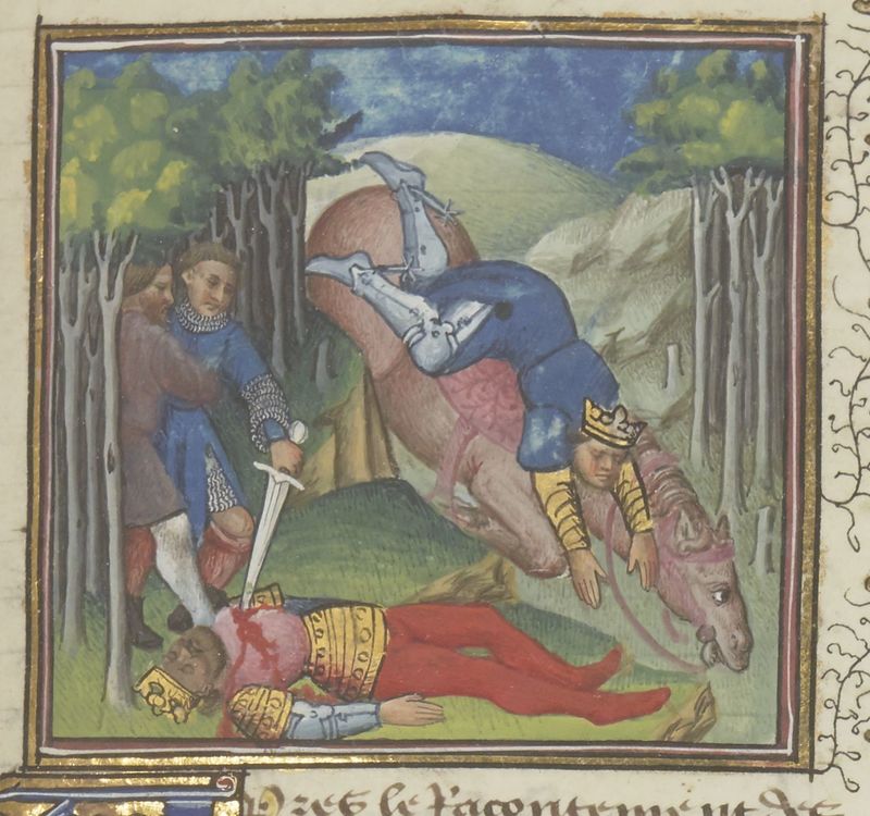 Parigi, Bibliothèque Nationale de France, Fr. 229, f. 179r. Il copista del manoscritto è Boniface de Remenant. Antioco viene ucciso nel bosco dai banditi; Seleuco cade da cavallo.