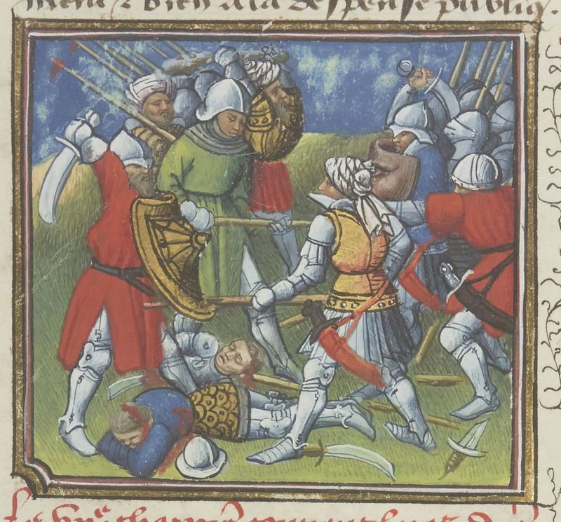 Parigi, Bibliothèque Nationale de France, Fr. 229, f. 192v. Il copista del manoscritto è Boniface de Remenant. Due eserciti si affrontano sul campo di battaglia.