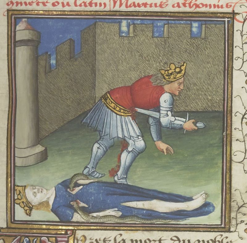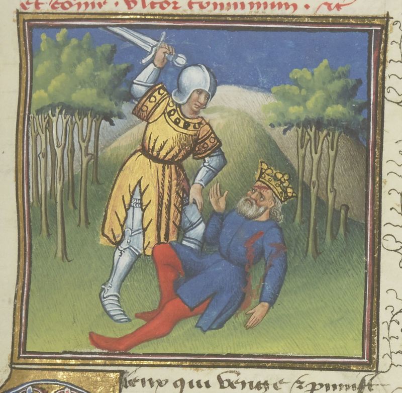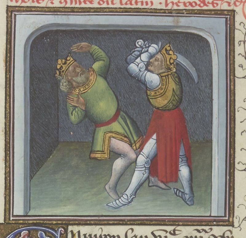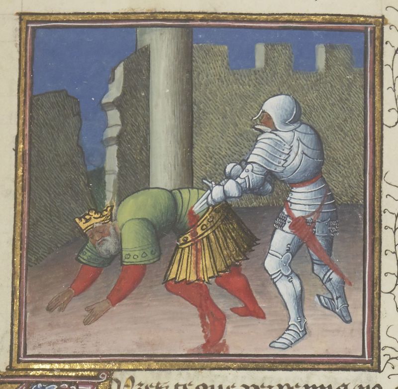 Parigi, Bibliothèque Nationale de France, Fr. 229, f. 239r. Il copista del manoscritto è Boniface de Remenant. Fraate uccide suo padre Orode.