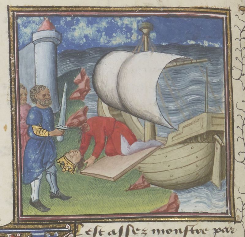 Parigi, Bibliothèque Nationale de France, Fr. 229, f. 212v. Il copista del manoscritto è Boniface de Remenant. Demetrio II viene decapitato appena sbarcato sulle coste di Tiro.