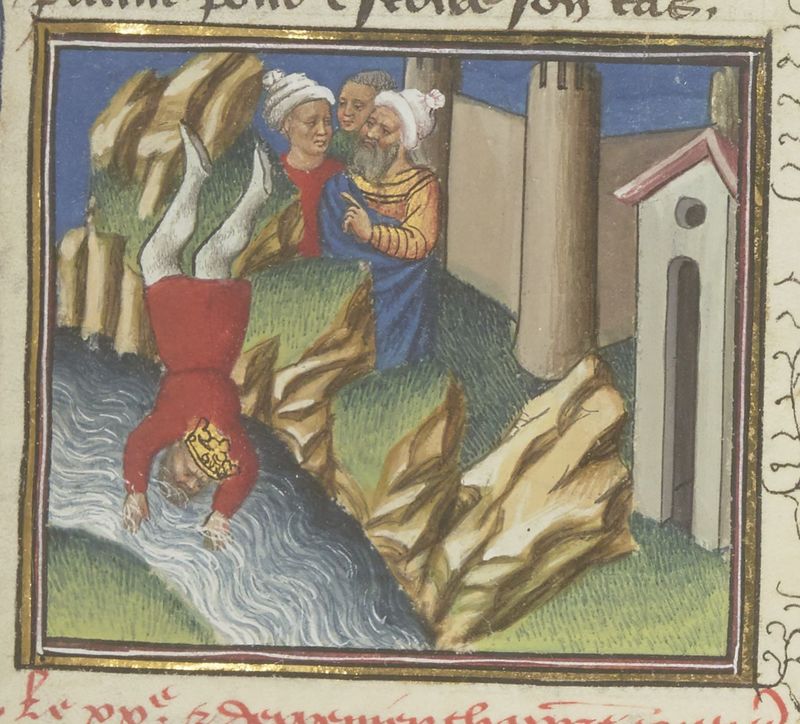 Parigi, Bibliothèque Nationale de France, Fr. 229, f. 218r. Il copista del manoscritto è Boniface de Remenant. Giugurta viene gettato dalla rupe Tarpea.