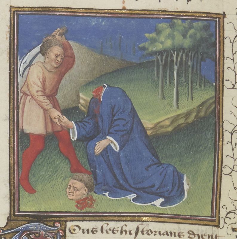 Parigi, Bibliothèque Nationale de France, Fr. 229, f. 256v. Il copista del manoscritto è Boniface de Remenant. Un uomo taglia la testa e una mano di Cicerone.