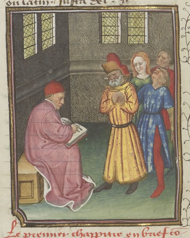 Parigi, Bibliothèque Nationale de France, Fr. 229, f. 132r. Il copista del manoscritto è Boniface de Remenant. Due dolenti colpiti dalla sfortuna si presentano allo studio dell'aut…