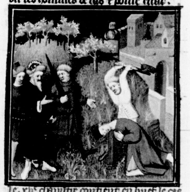 Parigi, Bibliothèque Nationale de France, Fr. 226, f. 236r. Simmaco e Boezio vengono decapitati.