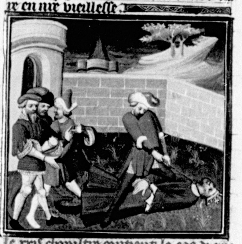 Bottega del Maestro del Duca di Bedford (1415-1420), La sconfitta di Diogene; Belzet monta a cavallo usando la schiena di Diogene come predellino