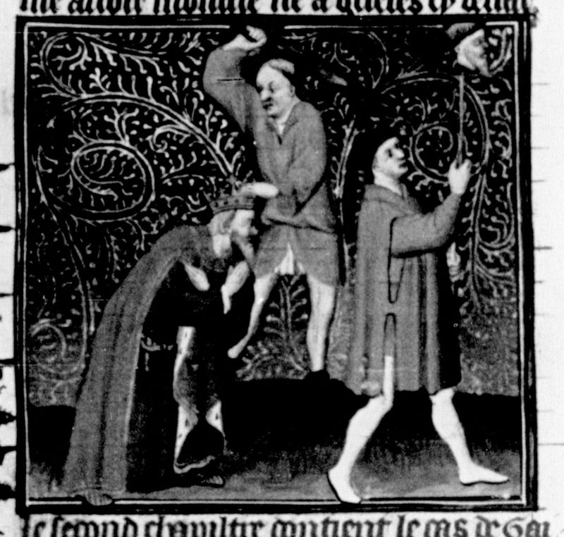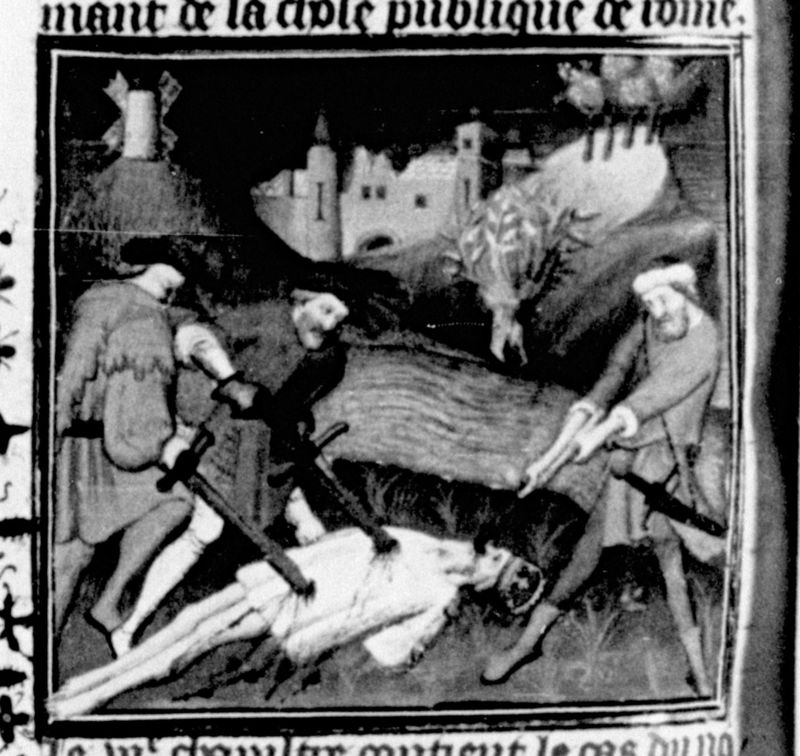 Parigi, Bibliothèque Nationale de France, Fr. 226, f. 158v. Marco Mario, fratello di Gaio Mario, viene decapitato; la testa di Gaio Mario viene issata su una picca.