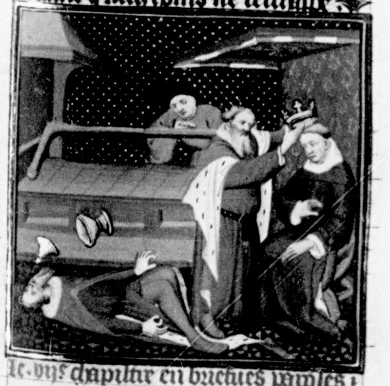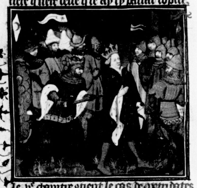 Parigi, Bibliothèque Nationale de France, Fr. 226, f. 166v. Orode, re dei Parti, abdica cedendo la corona al figlio Fraate.