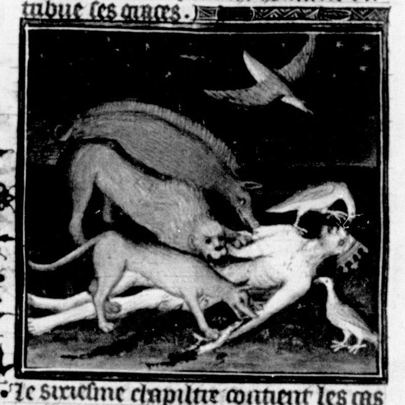 Parigi, Bibliothèque Nationale de France, Fr. 226, f. 166r. Il corpo di Eucratide, re dei Battriani, viene divorato dalle belve.