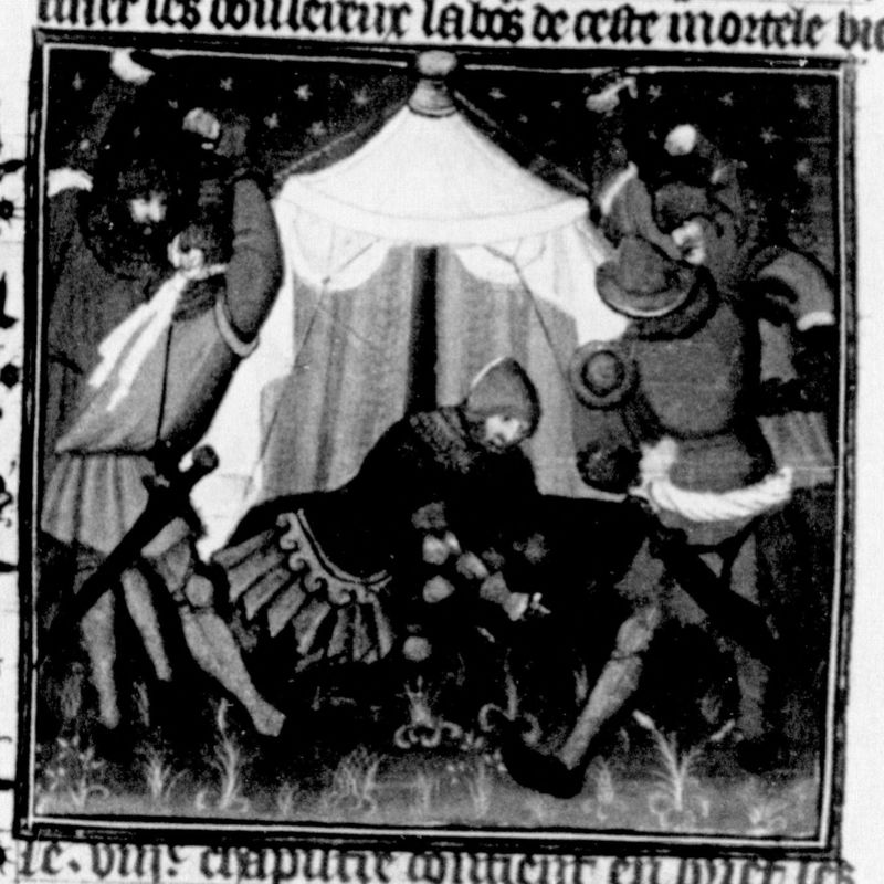 Parigi, Bibliothèque Nationale de France, Fr. 226, f. 217v. L'imperatore Claudio Quintillo viene ucciso dai suoi soldati dinanzi alla sua tenda da campo.