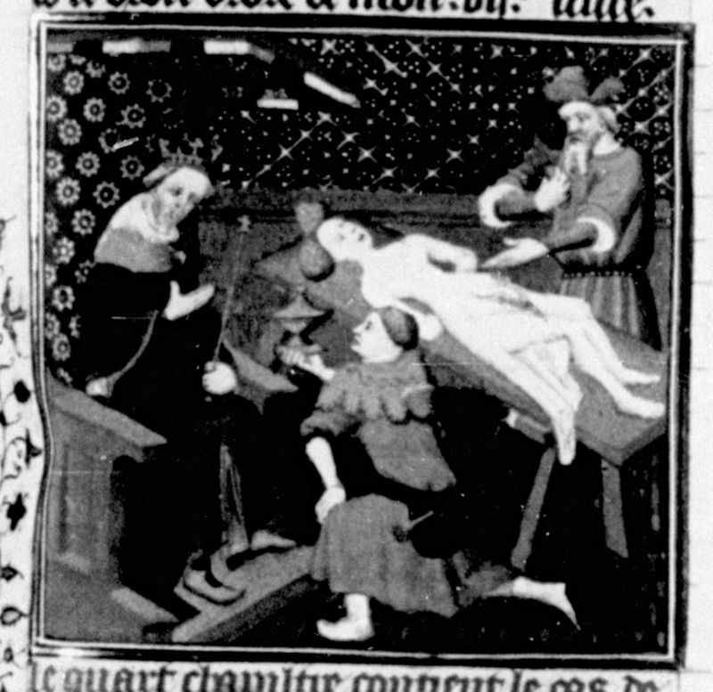 Parigi, Bibliothèque Nationale de France, Fr. 226, f. 196r. Nerone fa squartare la madre Agrippina e ne beve il sangue da una coppa.