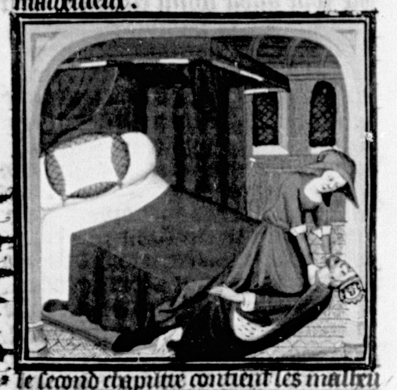 Parigi, Bibliothèque Nationale de France, Fr. 226, f. 212v. Marzia, la favorita dell'imperatore, strangola Commodo nella sua camera.