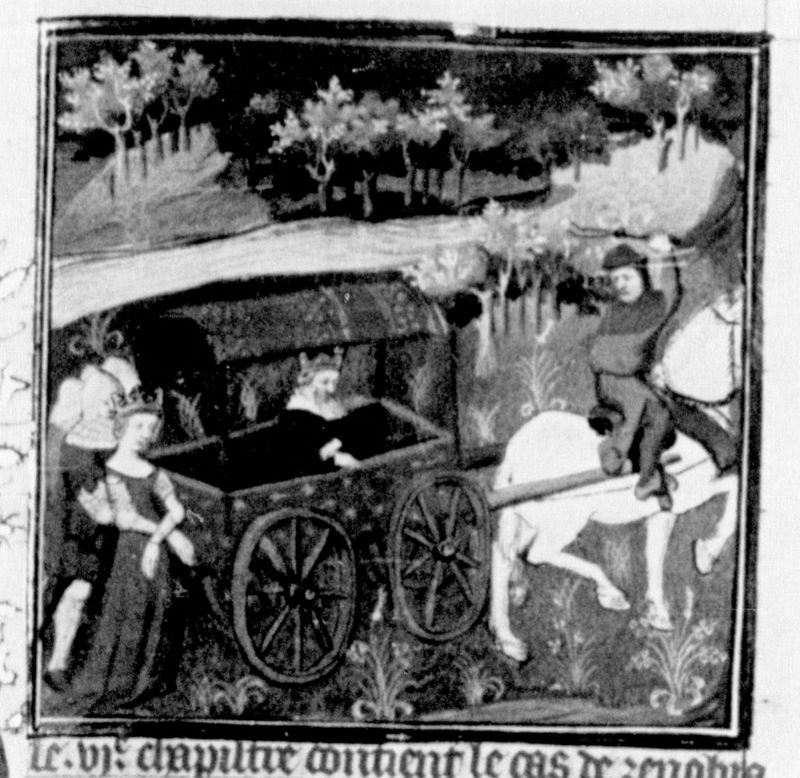 Parigi, Bibliothèque Nationale de France, Fr. 226, f. 219r. Zenobia viene condotta prigioniera insieme ad alcuni soldati dietro il carro trionfale di Aureliano.