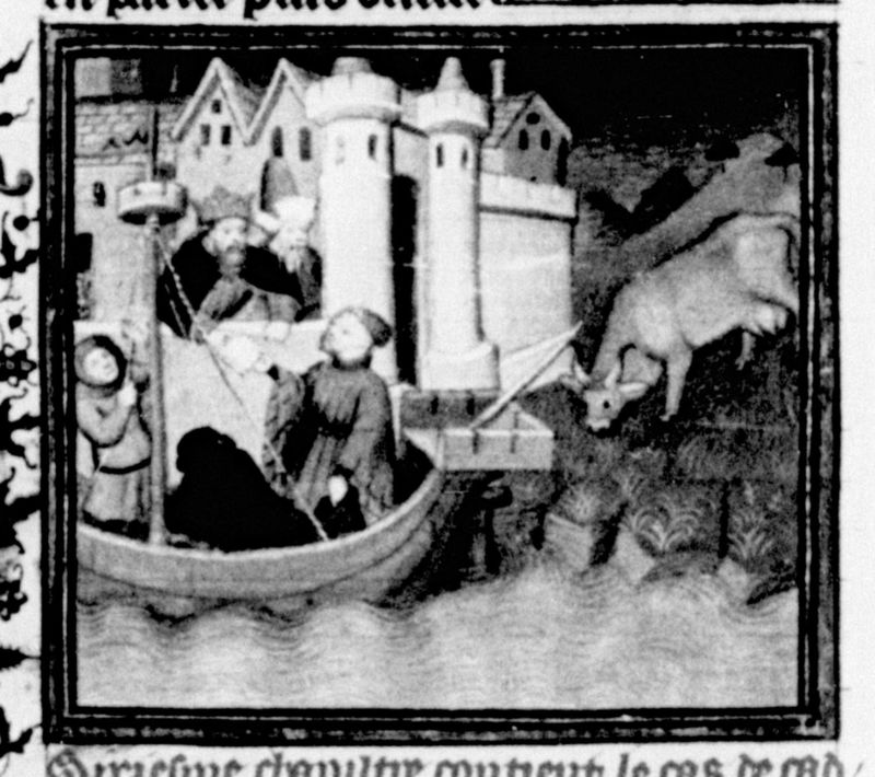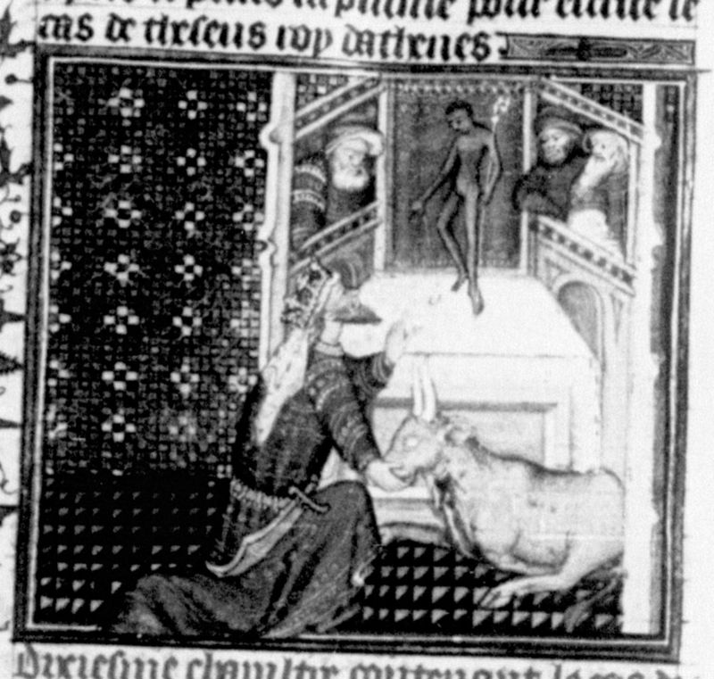 Parigi, Bibliothèque Nationale de France, Fr. 226, f. 17r. Teseo offre in sacrificio il Toro di Maratona ad un altare.
