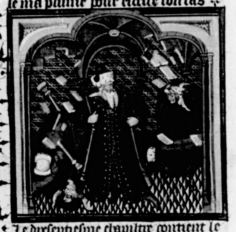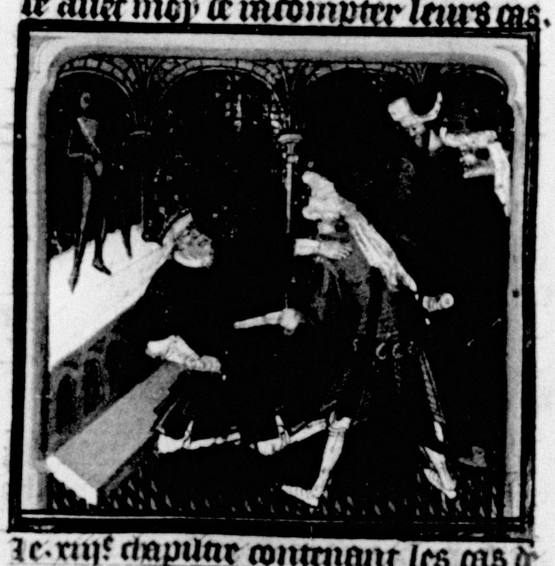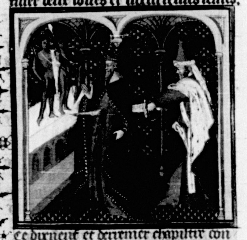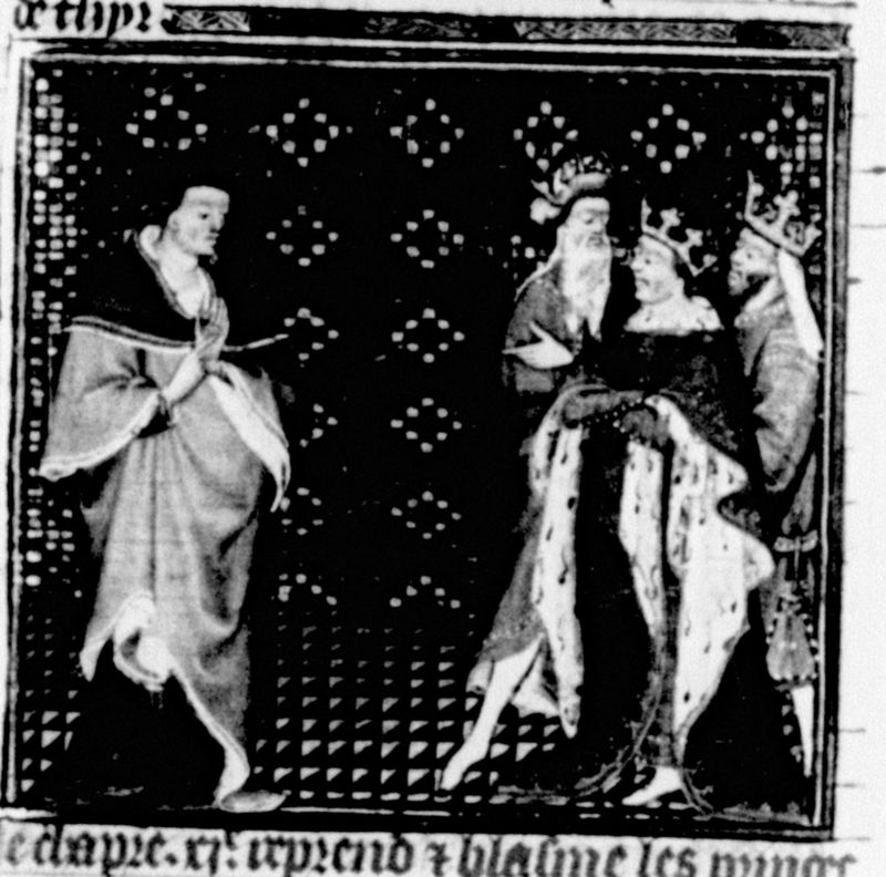 Parigi, Bibliothèque Nationale de France, Fr. 226, f. 37v. Roboamo, con un filatterio in mano, ascolta le suppliche dei suoi sudditi.