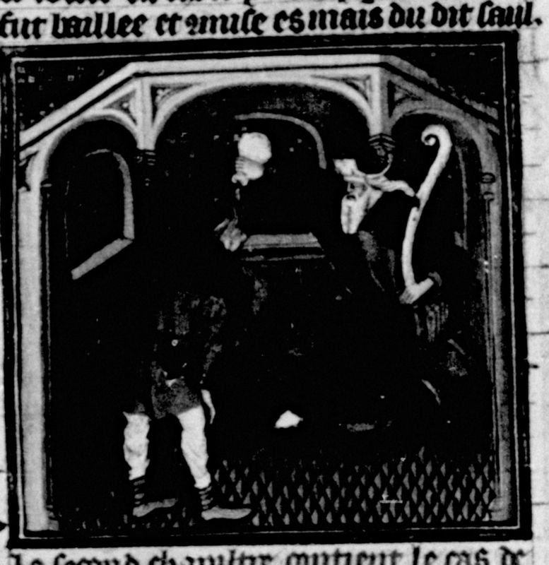 Parigi, Bibliothèque Nationale de France, Fr. 226, f. 35v. Samuele consacra Saul re ungendogli il capo con l'olio santo.