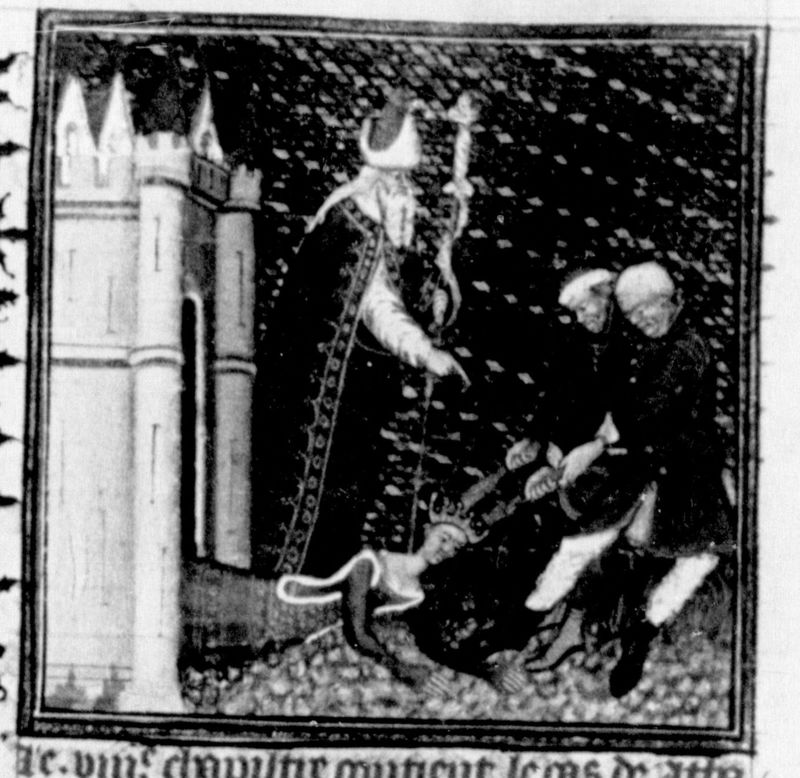 Parigi, Bibliothèque Nationale de France, Fr. 226, f. 50v. Salomone, dopo aver fatto uccidere i due figli di Sedecia, ordina che gli vengano strappati gli occhi con una tenaglia.