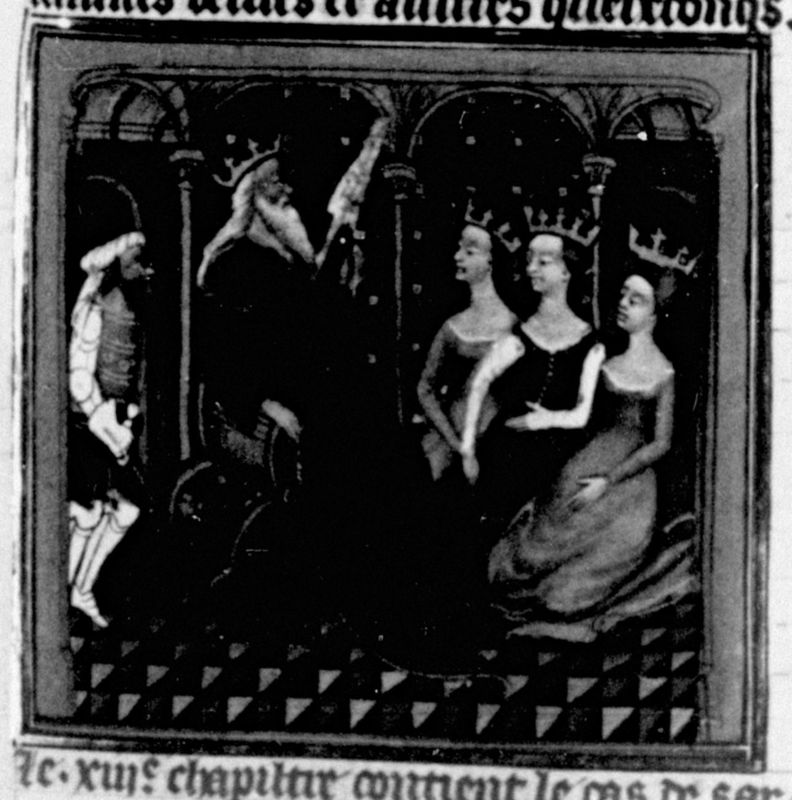 Parigi, Bibliothèque Nationale de France, Fr. 226, f. 19r. L'autore Giovanni Boccaccio incontra tre re.