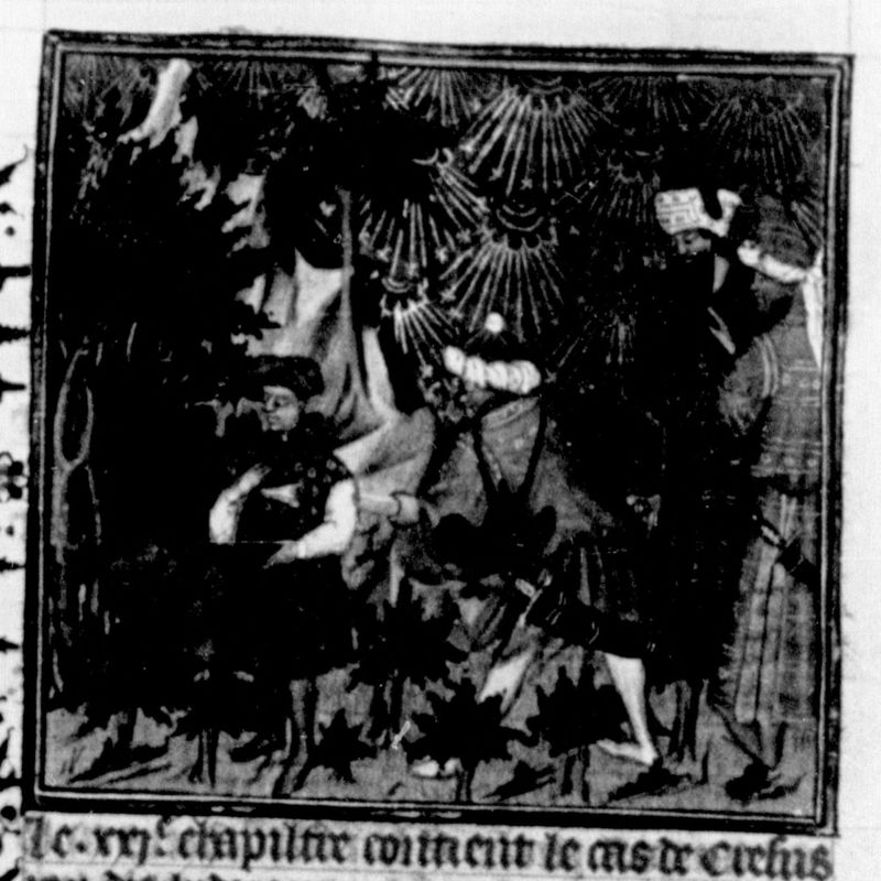 Parigi, Bibliothèque Nationale de France, Fr. 226, f. 14r. Laio interroga Apollo; il pastore Forbante slega il piccolo Edipo, appeso ad un albero per i piedi, per portarlo con sé.