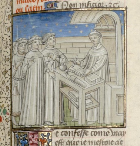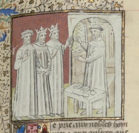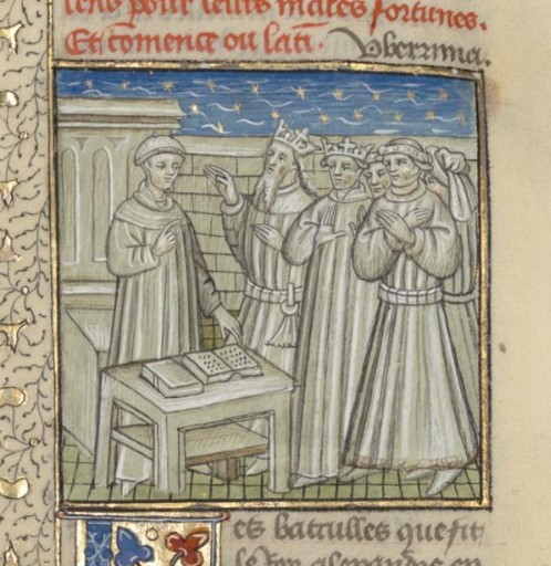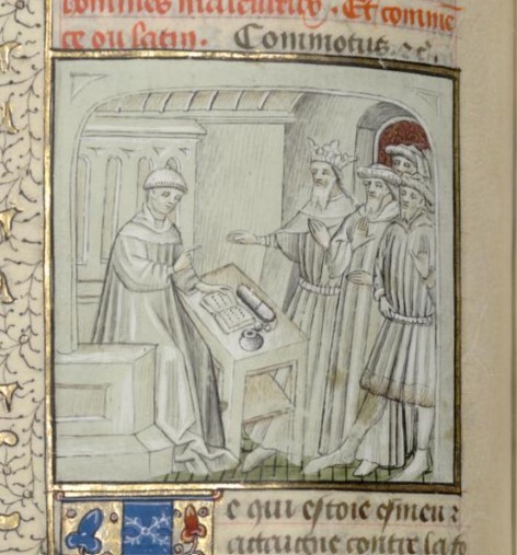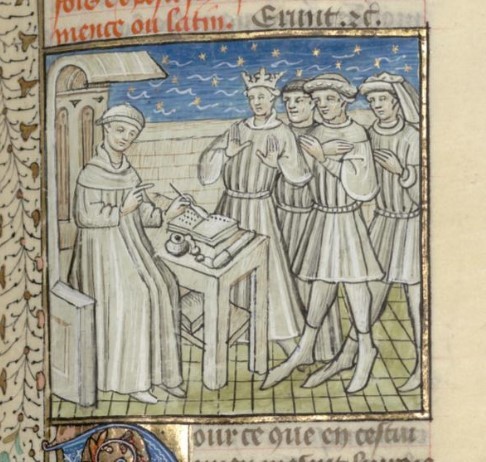 Parigi, Bibliothèque interuniversitaire Sainte-Geneviève, 1128, f. 106v. Giovanni Boccaccio incontra un gruppo di scrivani.