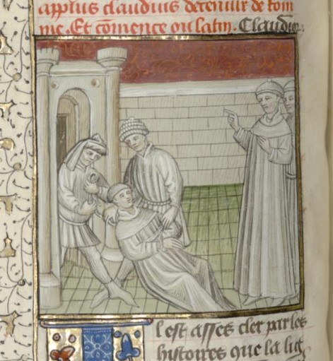Parigi, Bibliothèque interuniversitaire Sainte-Geneviève, 1128, f. 96v. Appio Claudio viene condotto in prigione.