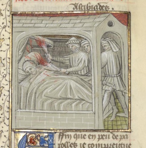 Miniatore francese (1425-1450), I sicari danno fuoco alla camera di Alcibiade