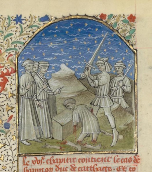 Parigi, Bibliothèque interuniversitaire Sainte-Geneviève, 1128, f. 109v. I Cartaginesi fanno mutilare il generale Annone prima dell'esecuzione.