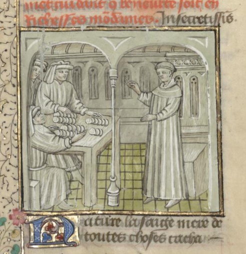 Parigi, Bibliothèque interuniversitaire Sainte-Geneviève, 1128, f. 110r. Giovanni Boccaccio si rivolge ad alcuni uomini che contano del denaro.