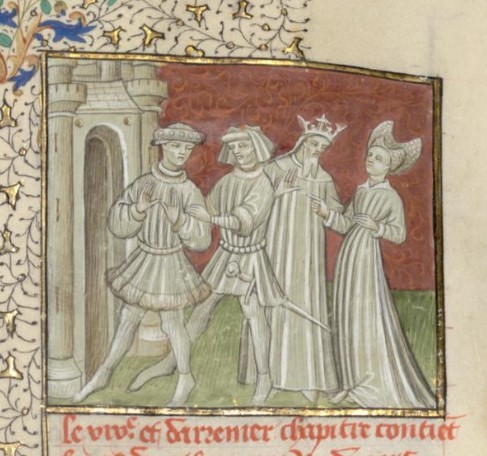 Parigi, Bibliothèque interuniversitaire Sainte-Geneviève, 1128, f. 115r. Artaserse perdona il fratello Ciro su richiesta della madre Parisatide.