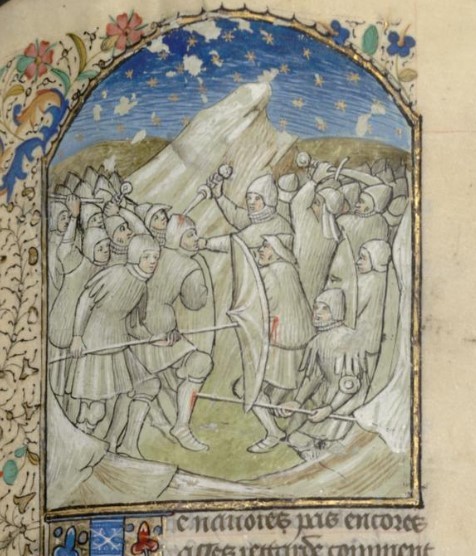 Parigi, Bibliothèque interuniversitaire Sainte-Geneviève, 1128, f. 130v. L'esercito macedone guidato da Alessandro affronta l'esercito persiano di Dario.