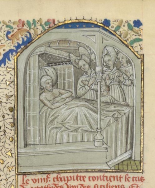 Parigi, Bibliothèque interuniversitaire Sainte-Geneviève, 1128, f. 123r. Dionigi di Siracusa giace morente nel letto, assistito da una donna.