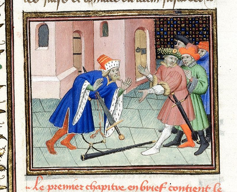 Parigi, Bibliothèque de l'Arsenal, 5193, f. 33v. Neottolemo (Pirro) uccide re Priamo mentre questi è inginocchiato in preghiera dinanzi a un altare.