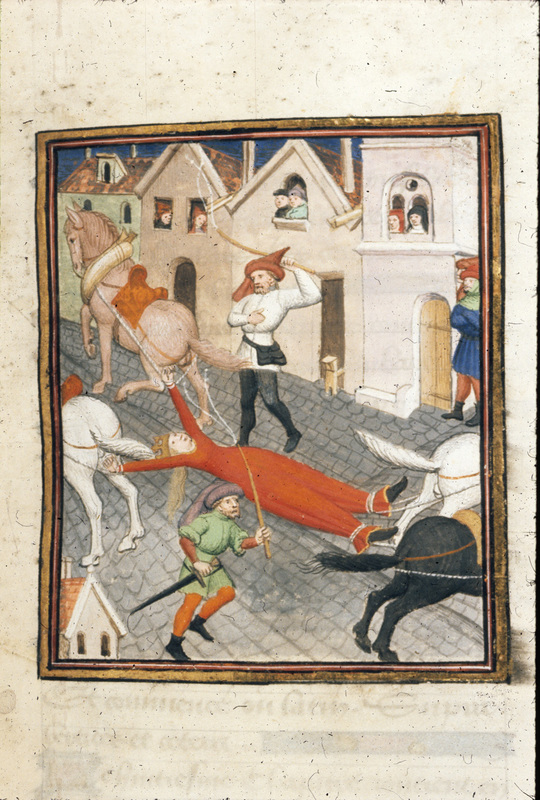 Londra, British Library, Royal 20 C IV, f. 310v. Brunichilde viene legata ai cavalli e squartata da due aguzzini; alcuni uomini e donne assistono alla scena affacciati alle finestr…