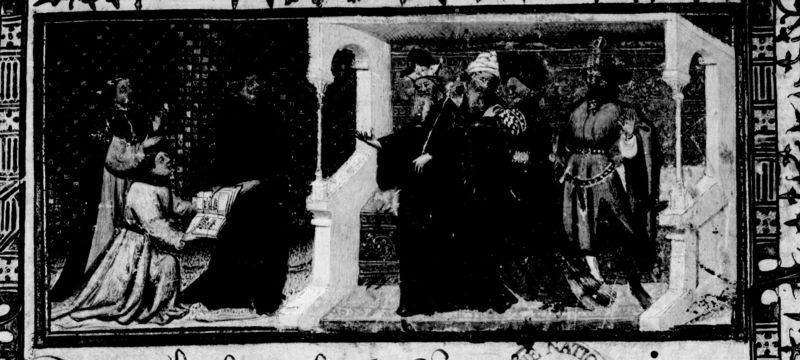 Parigi, Bibliothèque Nationale de France, Fr. 24289, f. 1r. Laurent de Premierfait, accompagnato dall'autore Giovanni Boccaccio vestito da chierico, offre il libro ad un nobile com…