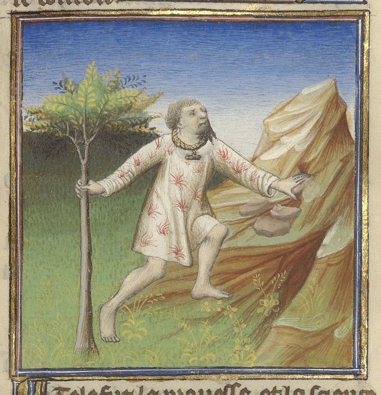 Parigi, Bibliothèque de l'Arsenal, 5193, f. 19v. Il pastore Forbante slega il piccolo Edipo, appeso ad un albero per i piedi, per portarlo con sé.